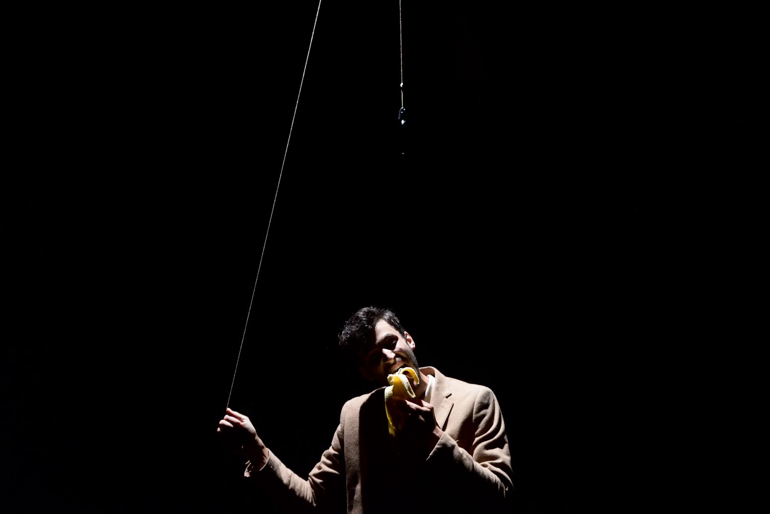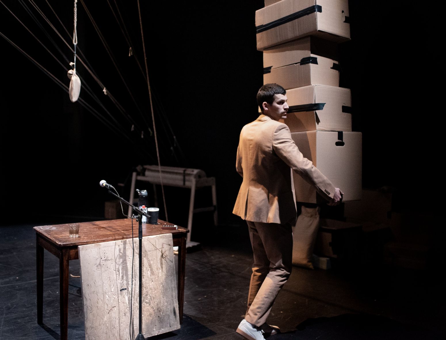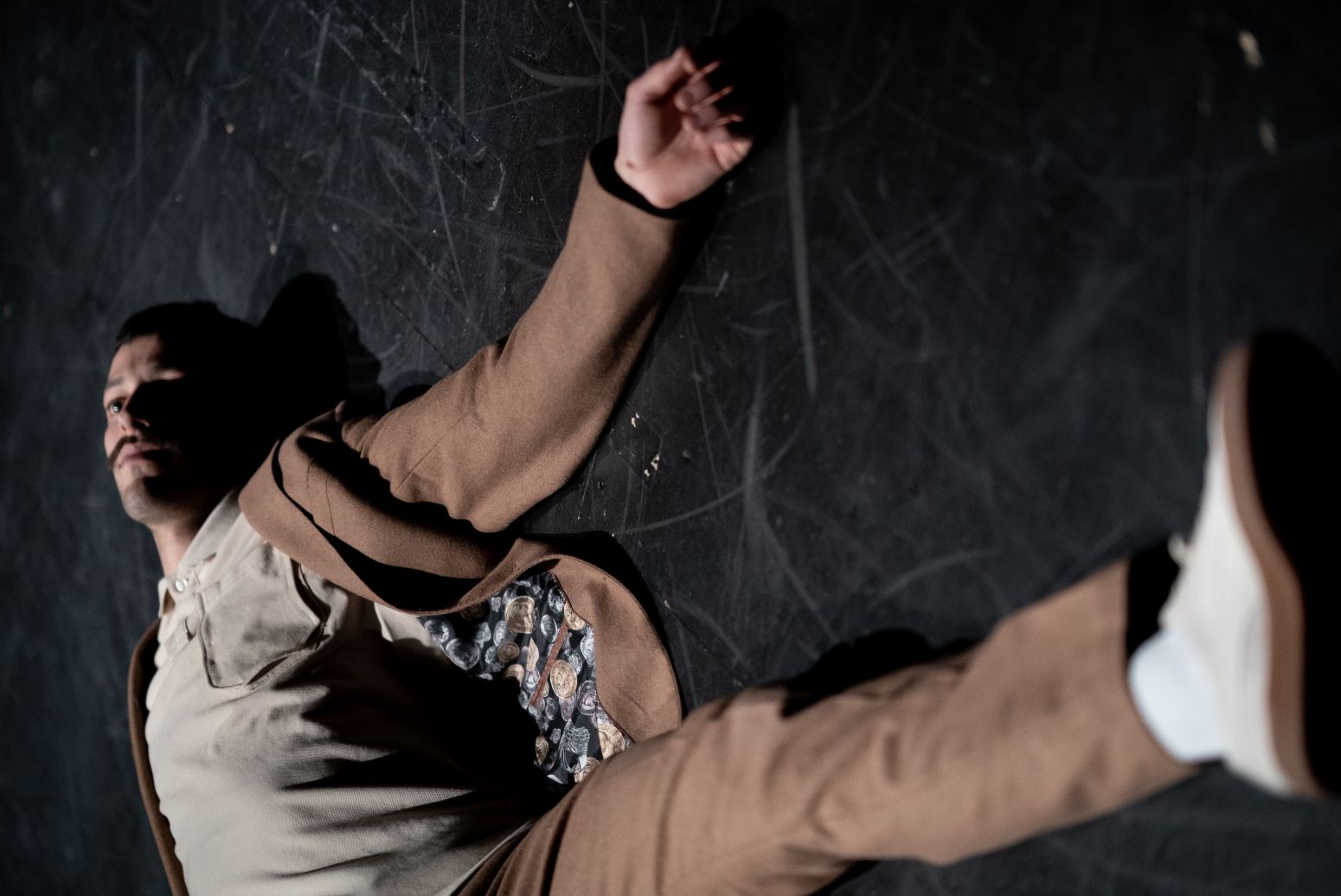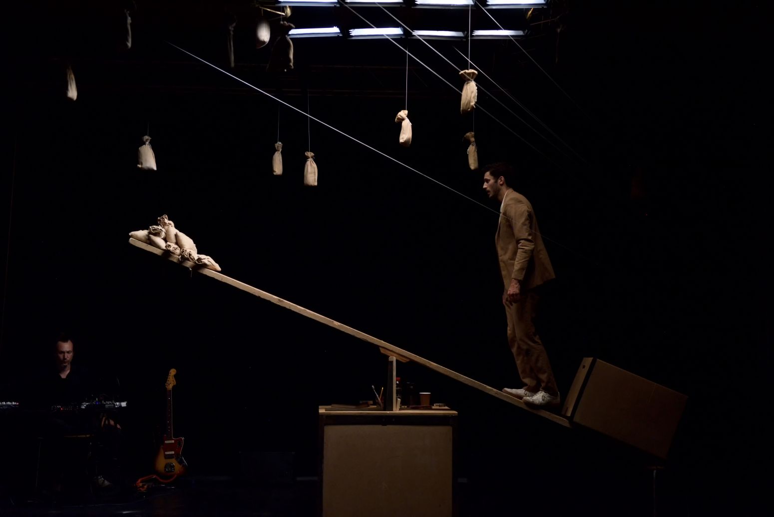 Dans un univers monochrome et accompagné en direct par les sons cosmiques de Raphael Raccuia, Marc Oosterhoff propose une performance sous haute tension. Avec un sens du burlesque rappelant Buster Keaton, il lutte désespérément contre l’ennui.